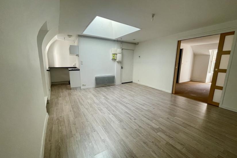 Nantes Cathédrale - Appartement T2 d'environ 38m² au 3ème étage offrant une pièce à vivre spacieuse avec coin cuisine, une chambre séparée et une salle d'eau.