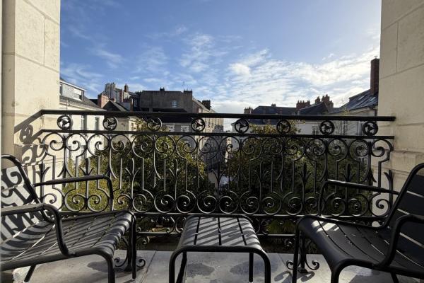 Vous profiterez également d’un petit balcon détente, offrant une vue dégagée sur les toits nantais et sur le jardin de l’hôtel particulier — un véritable havre de paix au calme absolu en plein cœur de la ville.