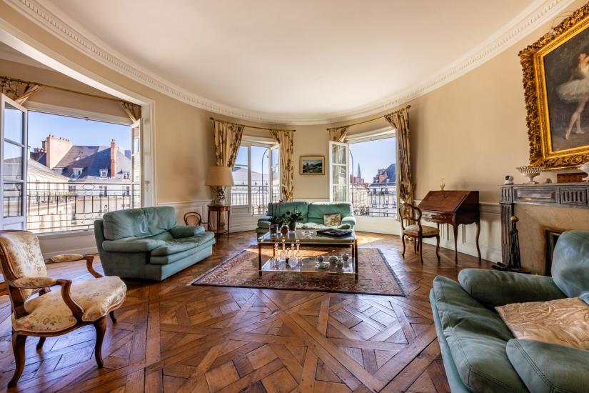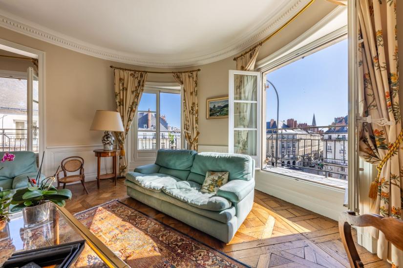 Une très belle entrée en rotonde desservant un superbe séjour ovale avec balcon filant offrant une superbe vue sur la place Graslin, petit salon avec vue sur la place Graslin, une grande salle à manger, une cuisine aménagée, 3 chambres dont un appartement parents de 25m² avec vue sur la place Graslin et salle de bains et une salle d’eau avec WC.