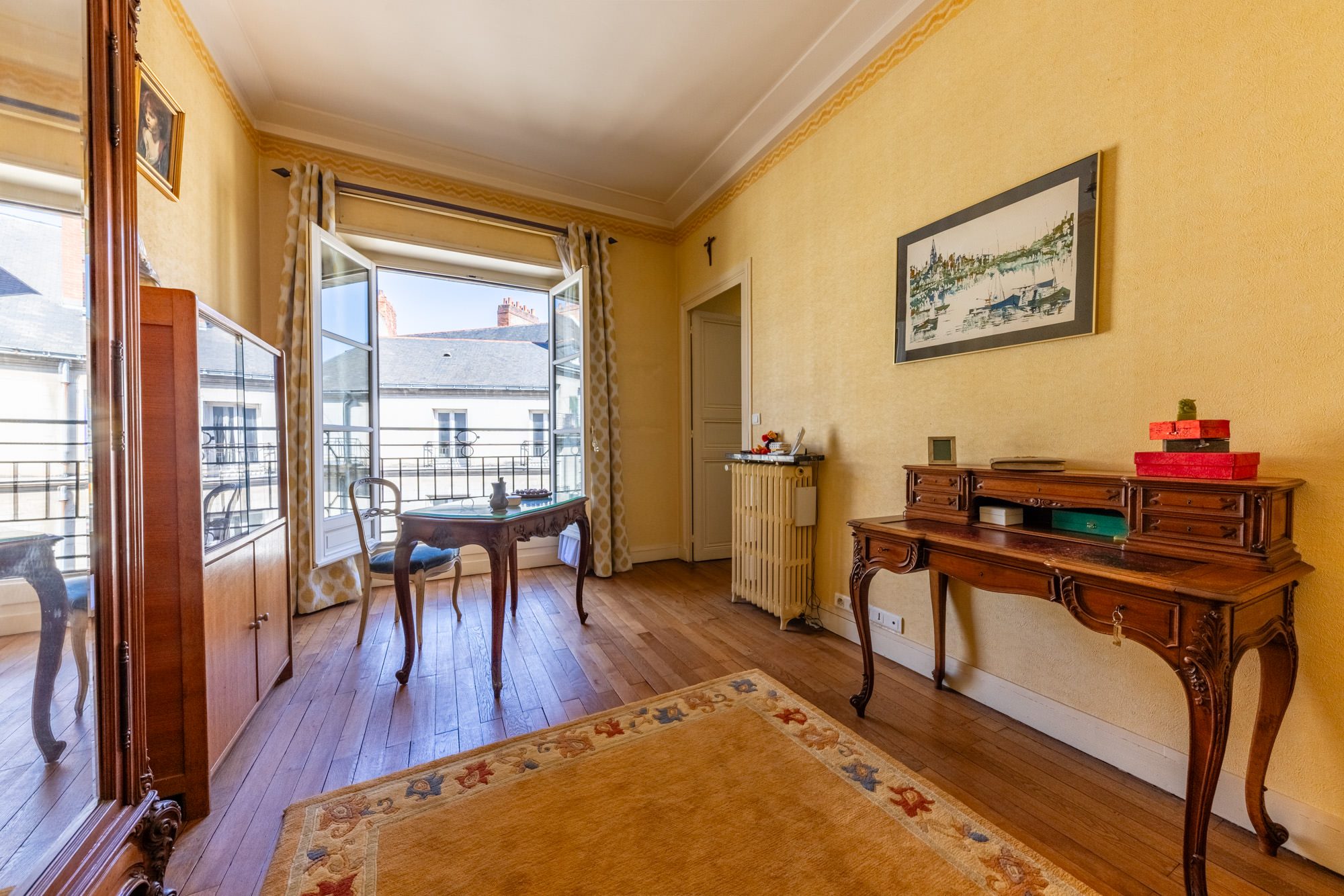 Une très belle entrée en rotonde desservant un superbe séjour ovale avec balcon filant offrant une superbe vue sur la place Graslin, petit salon avec vue sur la place Graslin, une grande salle à manger, une cuisine aménagée, 3 chambres dont un appartement parents de 25m² avec vue sur la place Graslin et salle de bains et une salle d’eau avec WC.