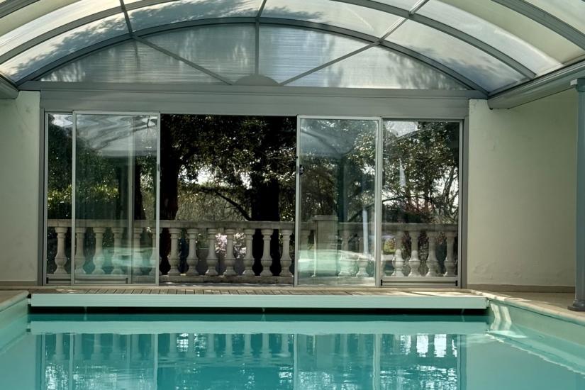 Cette demeure bourgeoise aux beaux volumes offre de multiples espaces de réceptions, des vues panoramiques sur son parc arboré & son étang clos de mur ainsi que sa vaste piscine à toit ouvrant et son espace plus confidentiel avec bar - cave à vin & cuisine/barbecue d'extérieur.