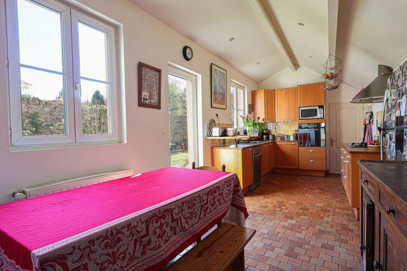 Dès l’entrée, les volumes s’ouvrent sur un joli séjour avec cheminée sur tomettes anciennes traversant Est-Ouest de 38 m² et qui se prolonge naturellement vers le jardin.