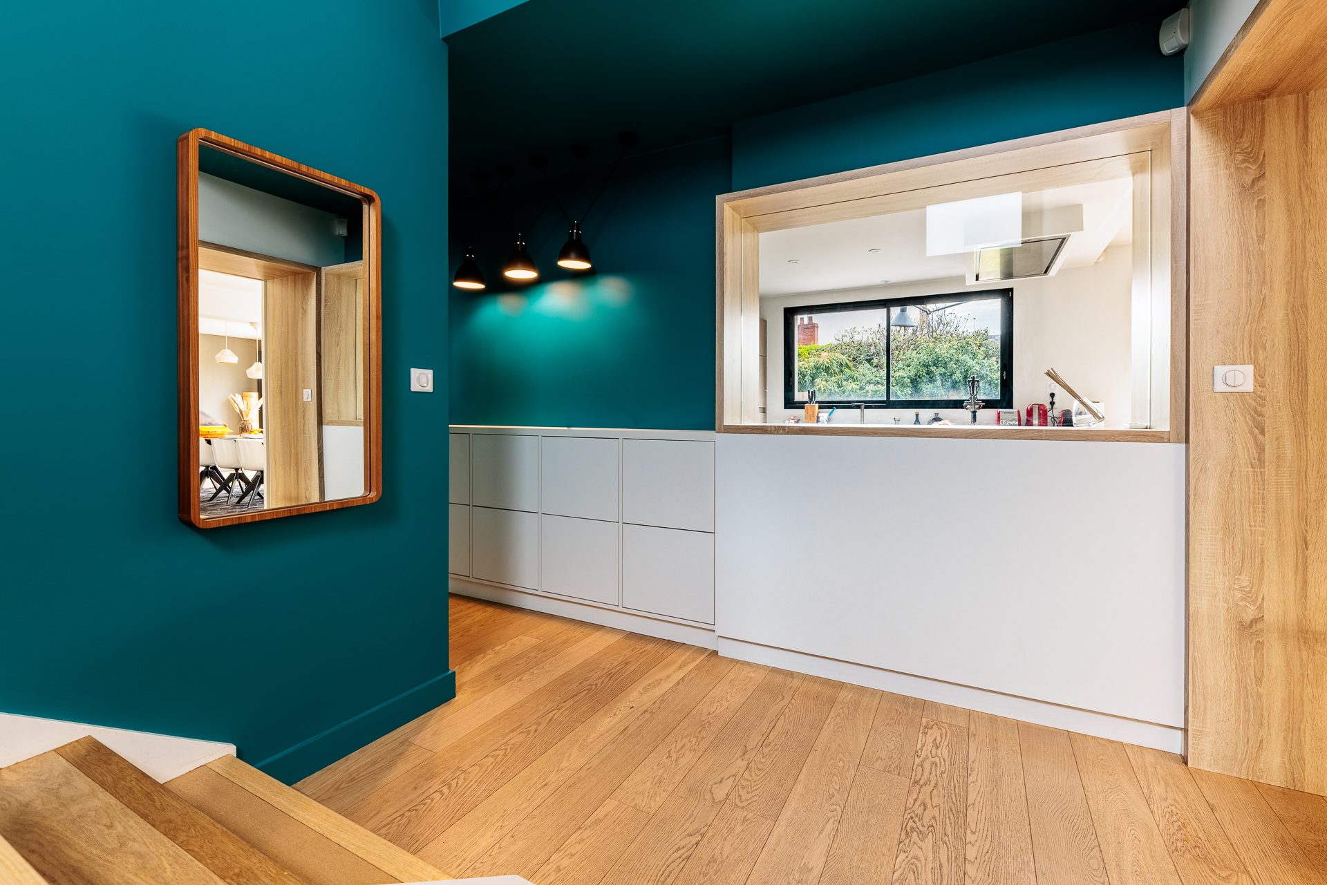 – parquet et cheminée pour une ambiance chaleureuse et contemporaine