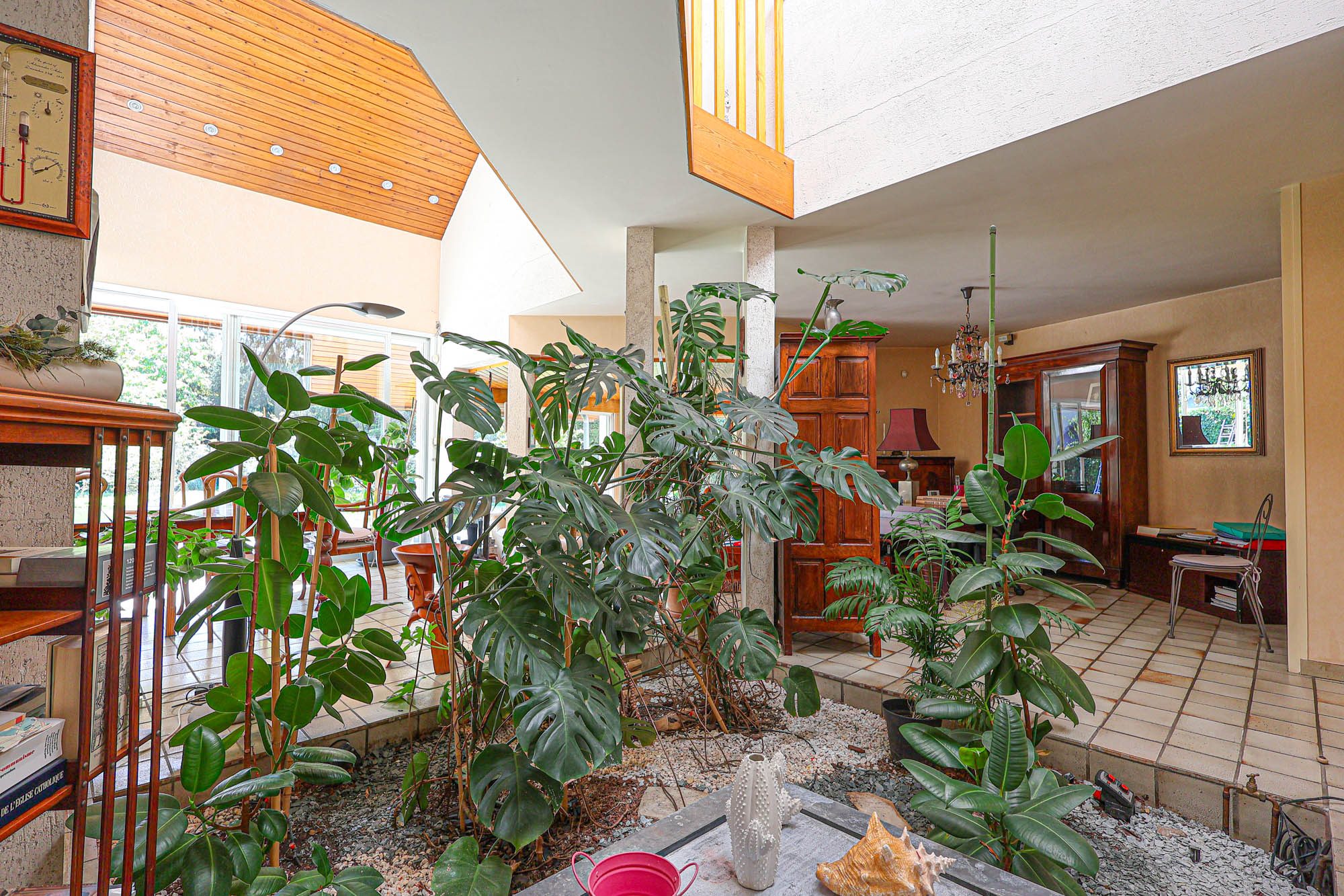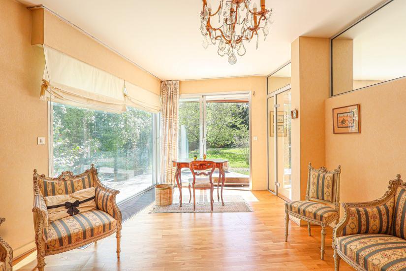 Dès l’entrée, les volumes s’ouvrent avec naturel vers une généreuse pièce de vie baignée de lumière au plafond cathédrale, prolongée de plain-pied par le jardin. Le salon, agrémenté d’une cheminée, invite à la convivialité, tandis qu’un bureau indépendant complète cet espace de réception.