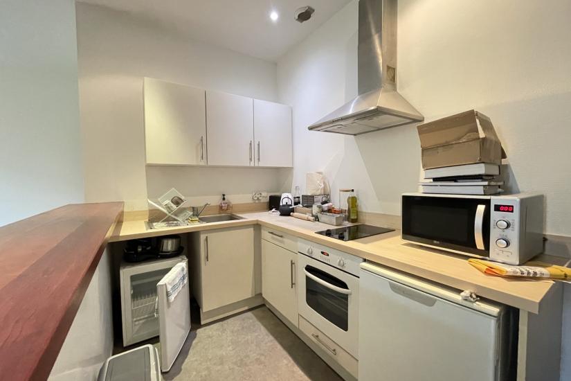 En hypercentre de Nantes, dans une arrière cours au calme. Ce spacieux T1 de 31m2 non meublé comprend une pièce de vie ainsi qu'une cuisine aménagée et équipée (plaques de cuisson, hotte, four, réfrigérateur) et une grande salle d'eau avec rangements et WC.