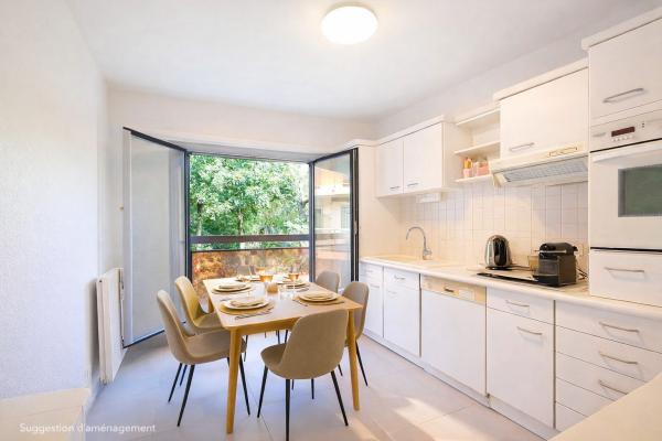 Baigné de lumière, il offre un bel espace de vie exposé sud-ouest, chaleureux avec son parquet, ainsi qu’une cuisine séparée, aménagée et équipée.
