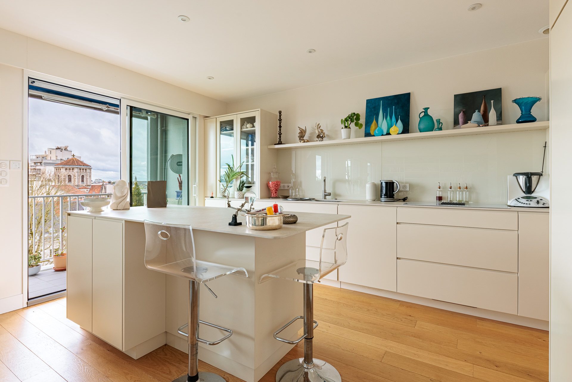 Au 5ᵉ étage avec ascenseur d’un immeuble de standing, cet appartement de 108 m² séduit d’emblée par sa luminosité et son large balcon-terrasse filant, idéalement exposé plein Sud, offrant une vue dégagée rare sur les toits de Nantes.