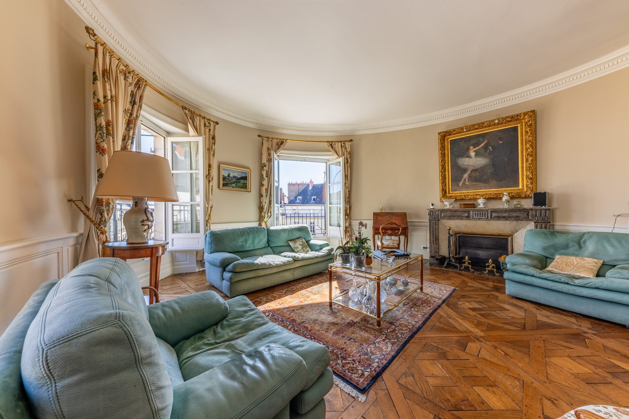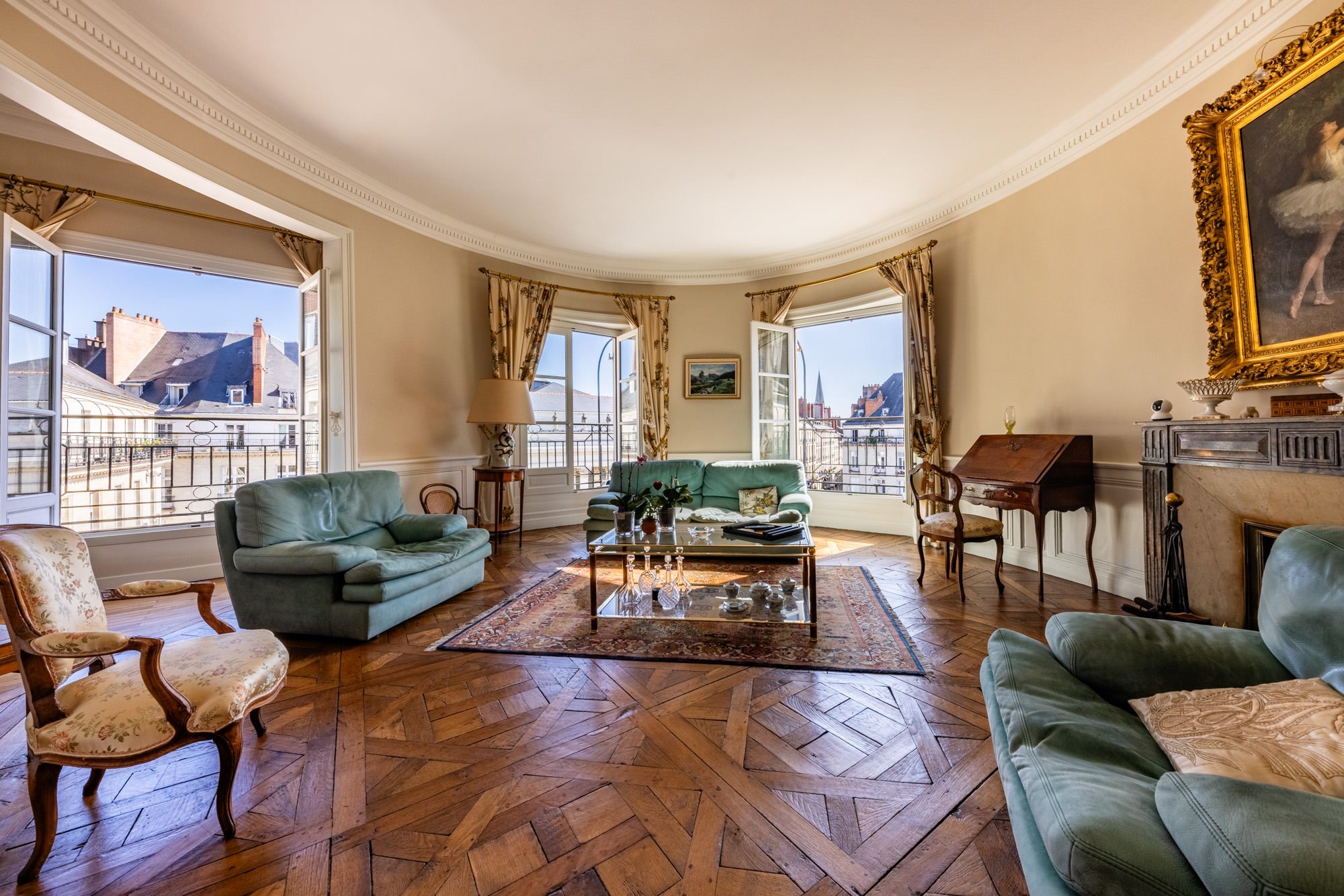 Une très belle entrée en rotonde desservant un superbe séjour ovale avec balcon filant offrant une superbe vue sur la place Graslin, petit salon avec vue sur la place Graslin, une grande salle à manger, une cuisine aménagée, 3 chambres dont un appartement parents de 25m² avec vue sur la place Graslin et salle de bains et une salle d’eau avec WC.