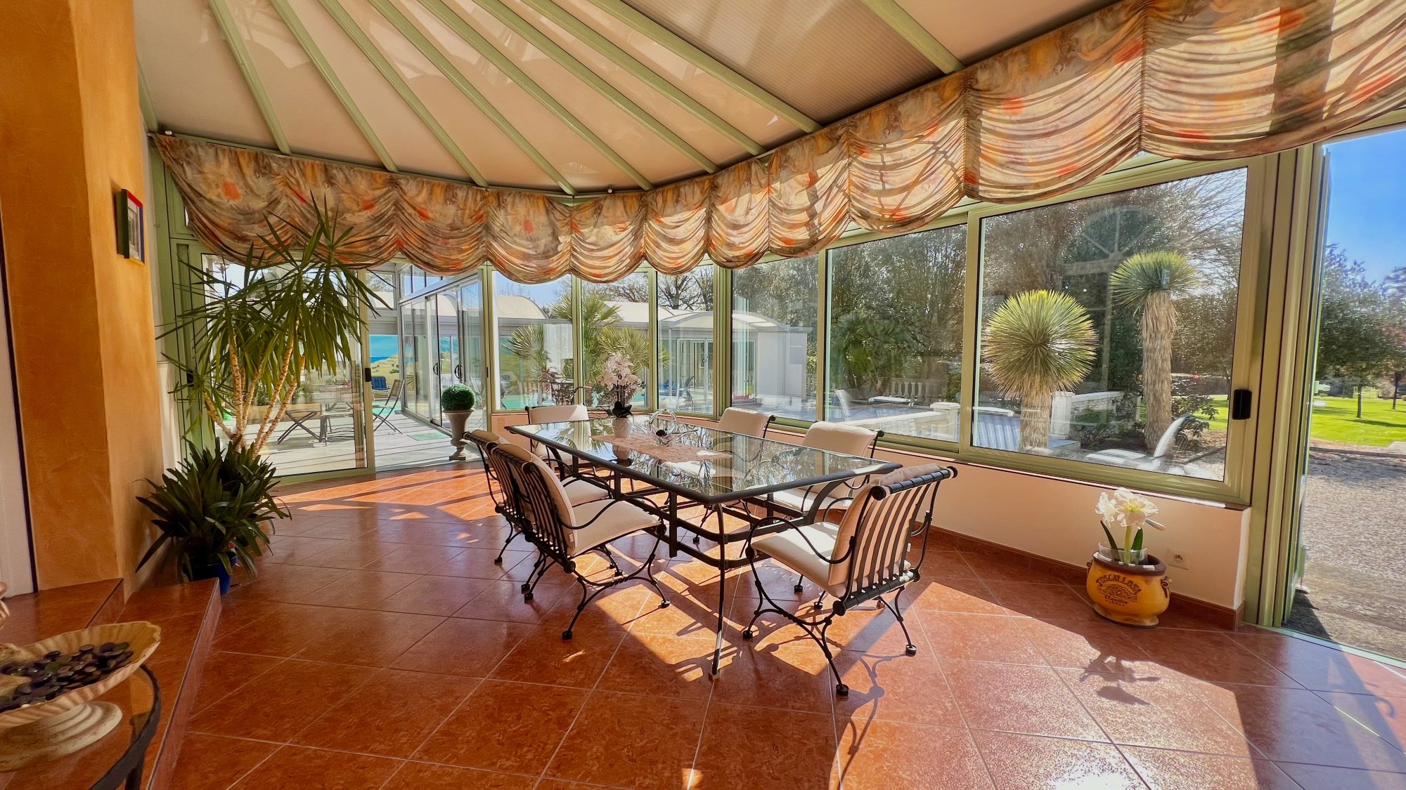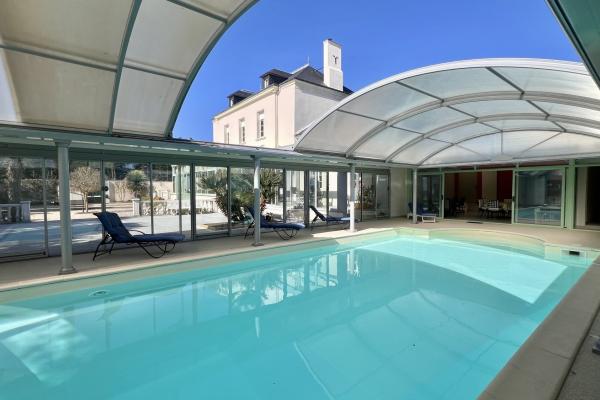 Cette demeure bourgeoise aux beaux volumes offre de multiples espaces de réceptions, des vues panoramiques sur son parc arboré & son étang clos de mur ainsi que sa vaste piscine à toit ouvrant et son espace plus confidentiel avec bar - cave à vin & cuisine/barbecue d'extérieur.