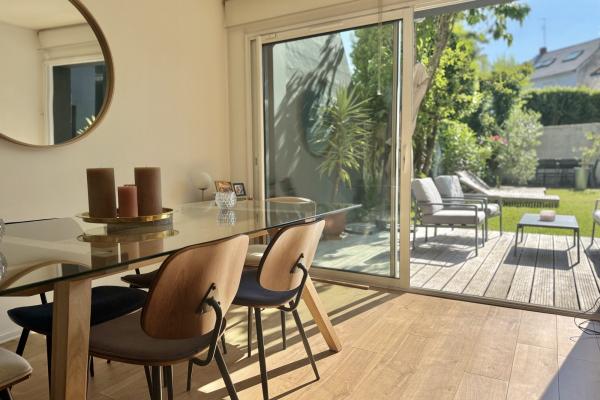 Jolie cuisine A/E, salle à manger face au jardin et salon/séjour agréable