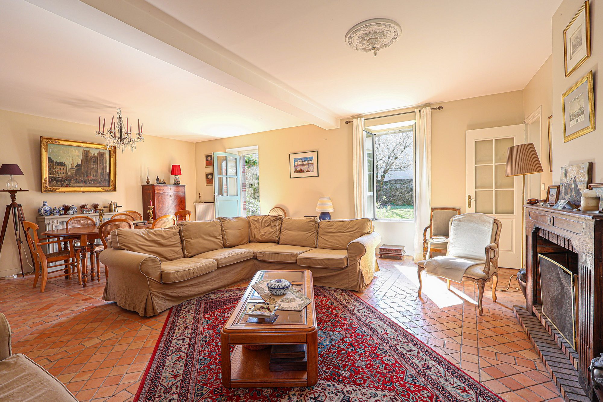 Dès l’entrée, les volumes s’ouvrent sur un joli séjour avec cheminée sur tomettes anciennes traversant Est-Ouest de 38 m² et qui se prolonge naturellement vers le jardin.