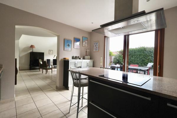 Au rez-de-chaussée : entrée, lumineux salon-séjour traversant ouvrant sur le jardin, cuisine ouverte, aménagée et équipée, avec îlot central, arrière-cuisine/buanderie, WC. Une chambre avec salle de bains complete le rdc.