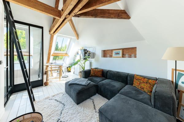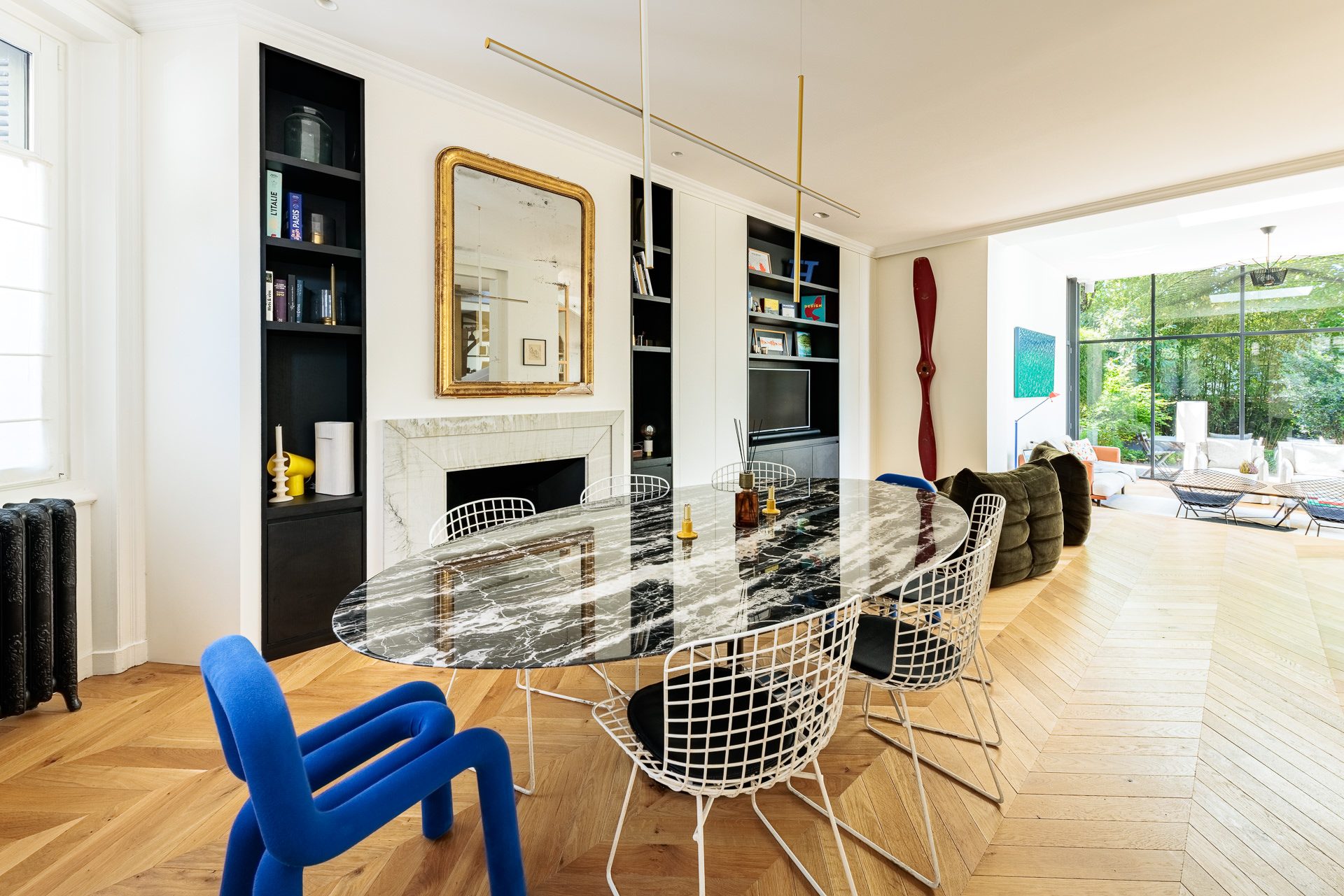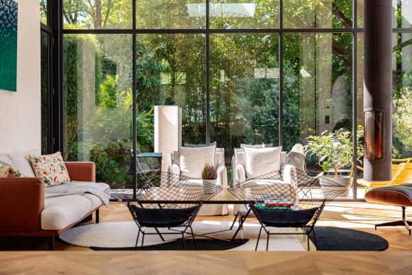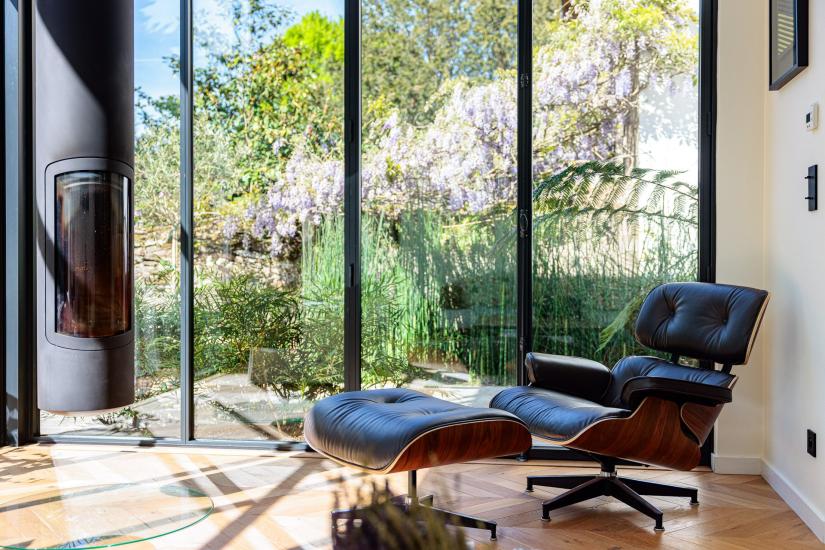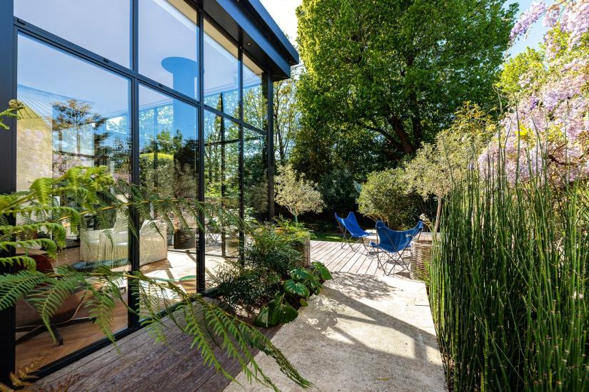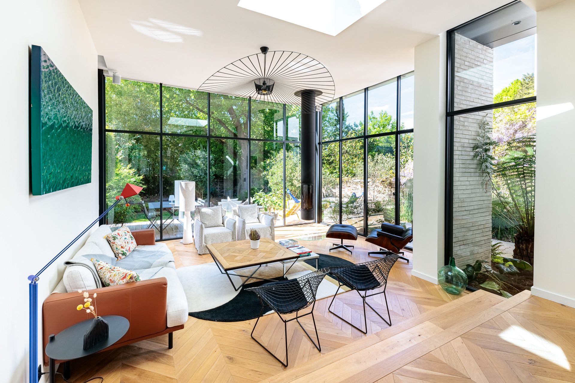 Récemment repensée par un architecte, elle conjugue avec justesse le charme de l’ancien avec le confort et la raffinement d'une rénovation contemporaine. La double réception traversante, baignée de lumière, s’ouvre généreusement sur la terrasse grâce à de larges ouvertures, offrant de superbes vues sur un jardin paysagé et préservé des regards.