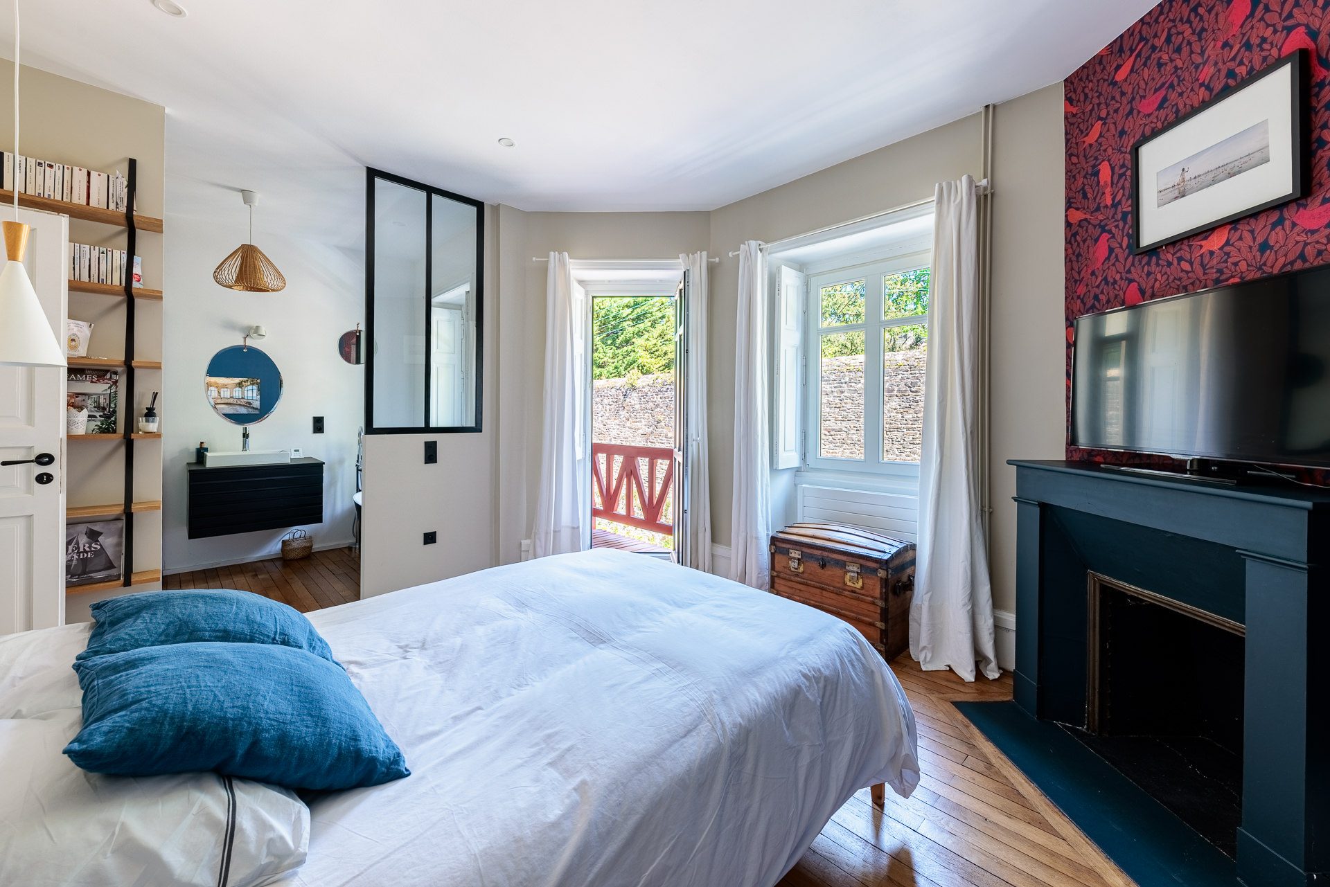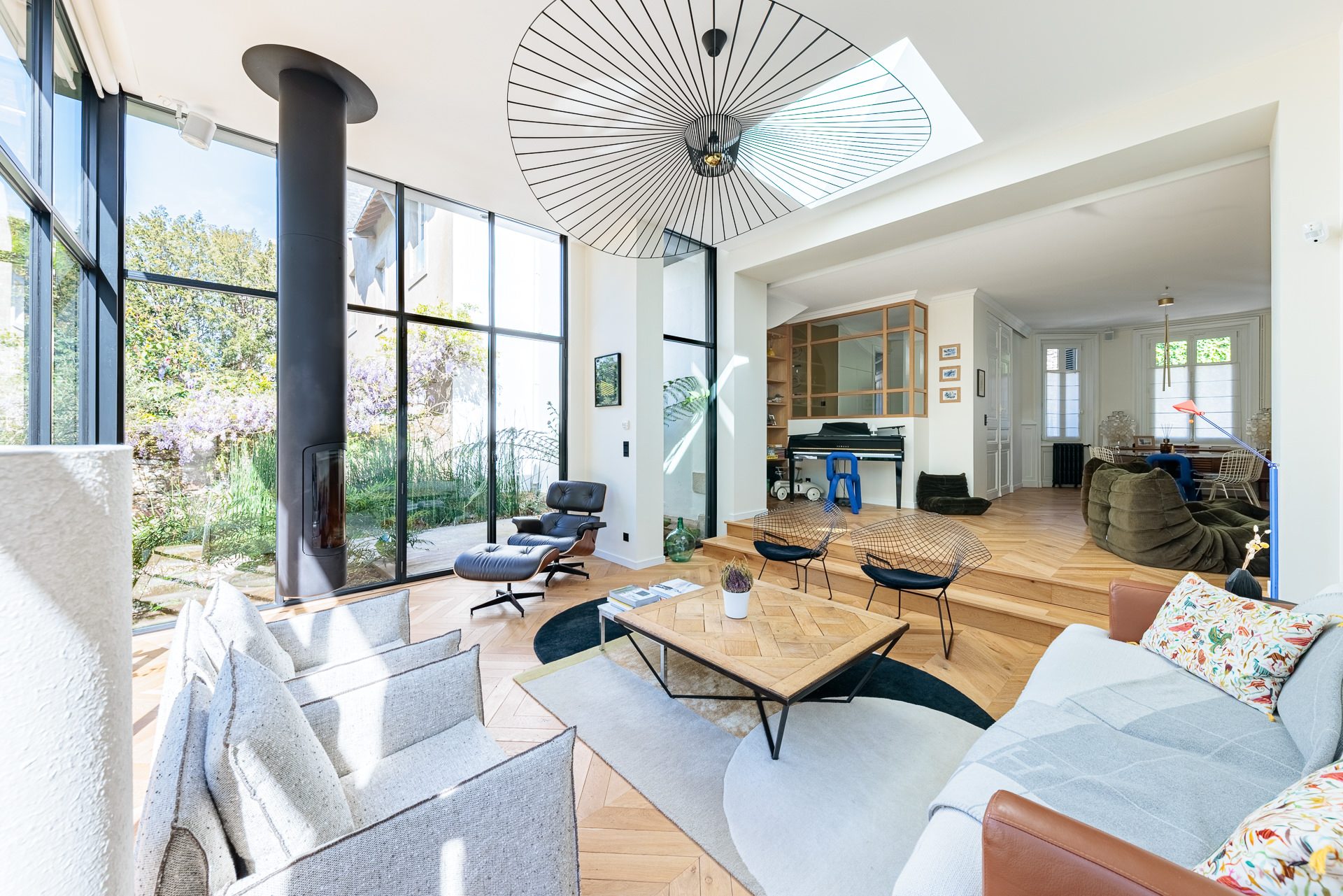 Récemment repensée par un architecte, elle conjugue avec justesse le charme de l’ancien avec le confort et la raffinement d'une rénovation contemporaine. La double réception traversante, baignée de lumière, s’ouvre généreusement sur la terrasse grâce à de larges ouvertures, offrant de superbes vues sur un jardin paysagé et préservé des regards.