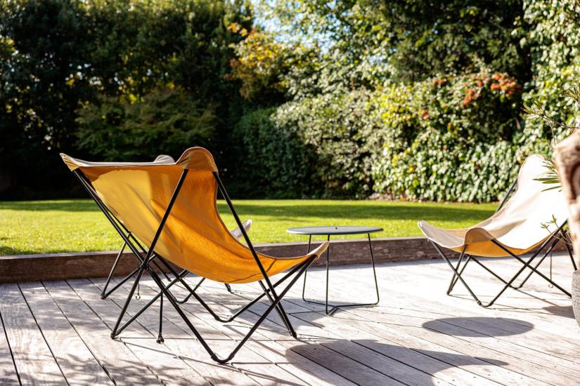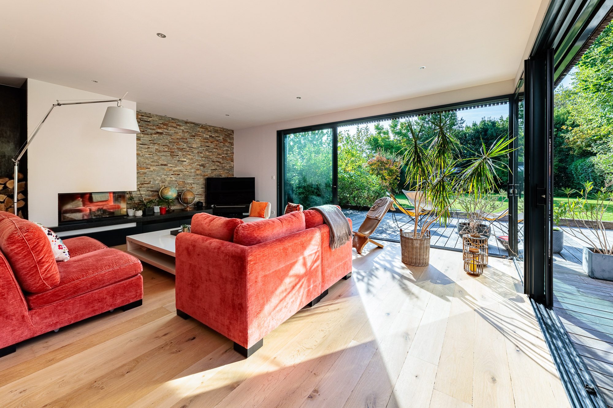 De plain-pied sur la terrasse et le jardin, la maison offre une spacieuse double réception