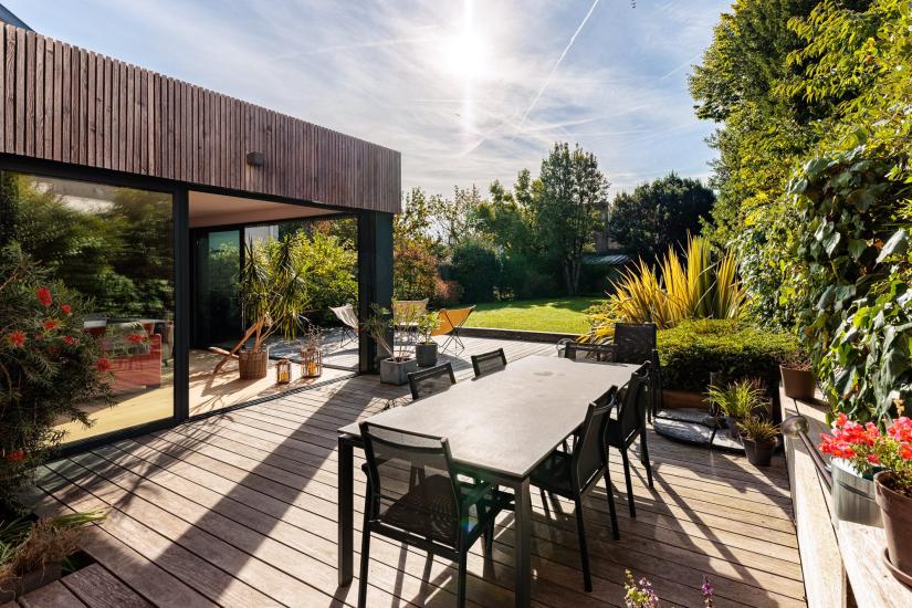 Implantée sur une belle parcelle de 513 m² exposée plein Sud, cette maison d’architecte familiale séduit par ses volumes, sa luminosité et la qualité de ses prestations.