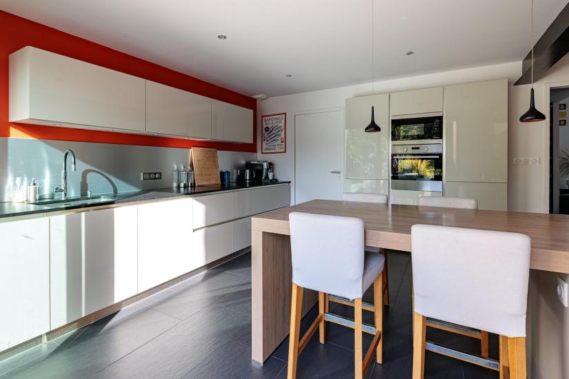 (cheminée) baignée de lumière, ouverte sur un jardin paysagé soigneusement entretenu. La cuisine contemporaine, conviviale et fonctionnelle, profite elle aussi d’une agréable vue sur l’extérieur.