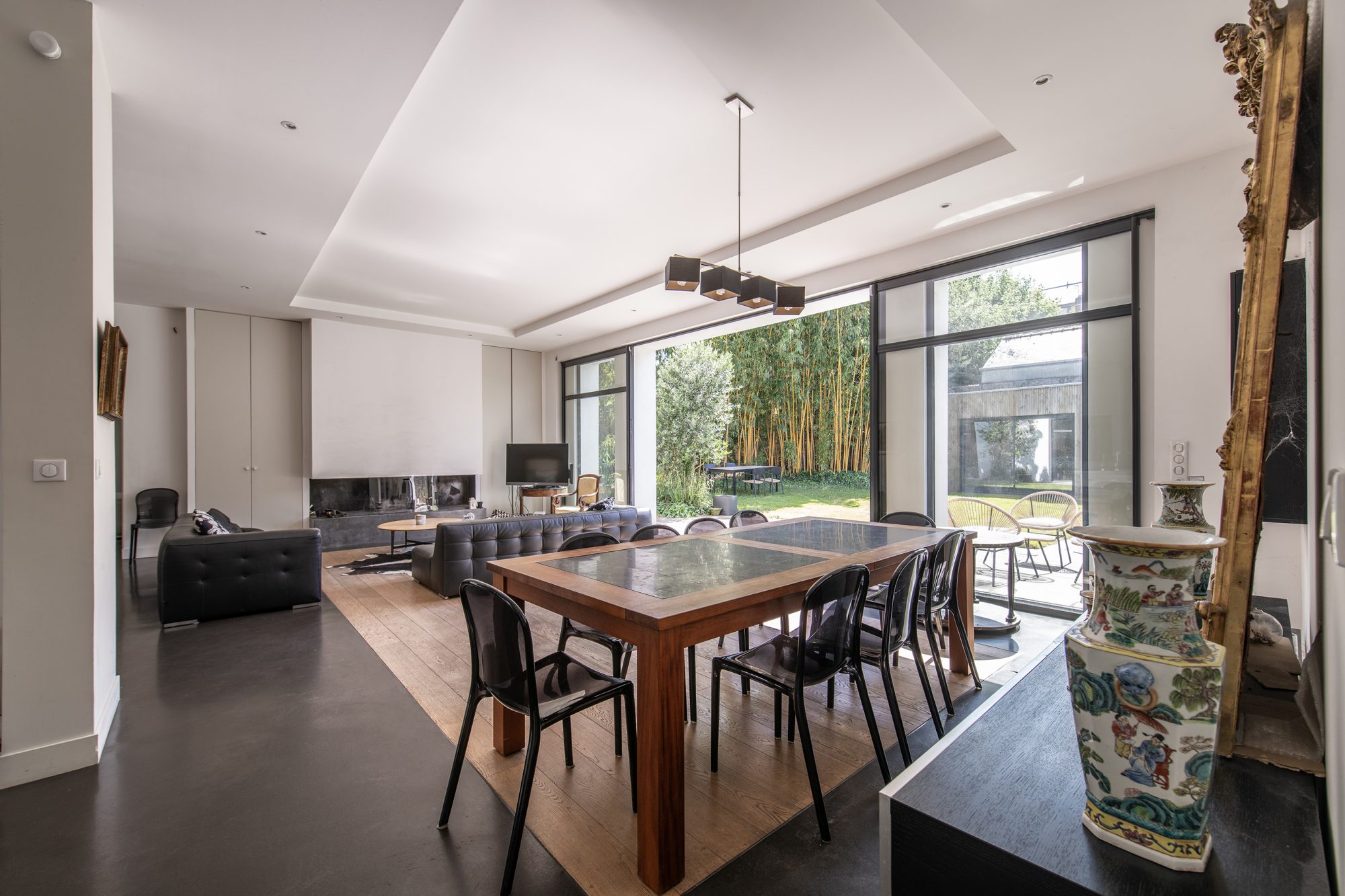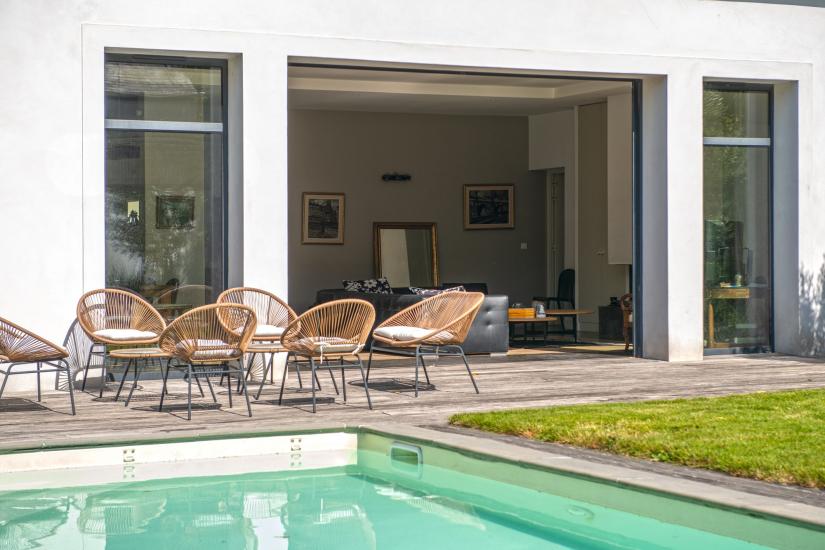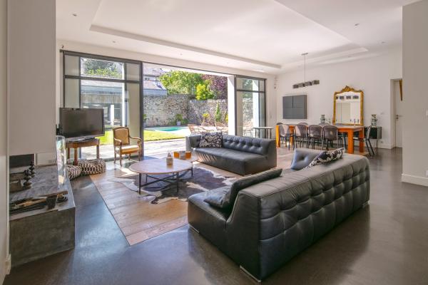 Entièrement repensée par un architecte, cette maison séduit par ses volumes généreux, sa luminosité et la qualité de ses prestations.Dès l’entrée, la double réception s’ouvre largement sur une terrasse exposée sud-ouest, offrant une continuité naturelle entre les espaces intérieurs et le jardin. La grande baie vitrée à galandage prolonge le séjour vers un agréable jardin arboré d’environ 300 m², agrémenté d’une piscine discrètement protégée des regards.