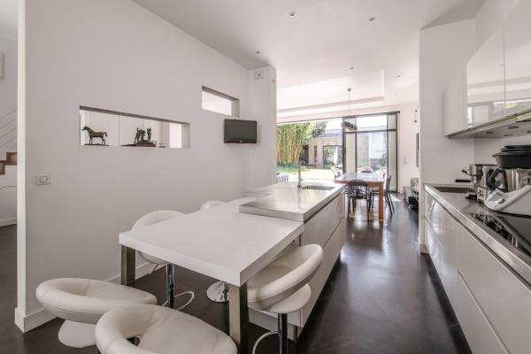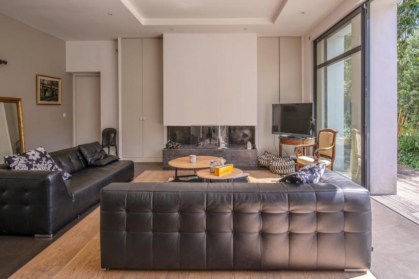 Entièrement repensée par un architecte, cette maison séduit par ses volumes généreux, sa luminosité et la qualité de ses prestations.Dès l’entrée, la double réception s’ouvre largement sur une terrasse exposée sud-ouest, offrant une continuité naturelle entre les espaces intérieurs et le jardin. La grande baie vitrée à galandage prolonge le séjour vers un agréable jardin arboré d’environ 300 m², agrémenté d’une piscine discrètement protégée des regards.