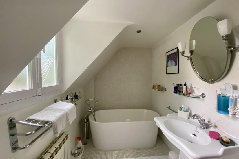 La maison propose des volumes généreux et une distribution harmonieuse : cinq chambres, deux bureaux et un salon bibliothèque composent des espaces modulables, adaptés à une vie familiale.