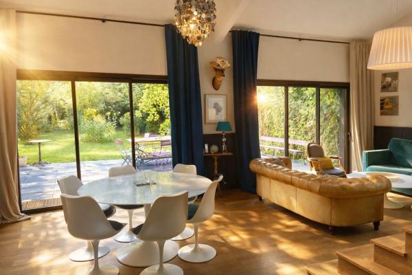 Entièrement rénovée, le séjour baigné de lumière offre une belle hauteur sous plafond et est prolongé par de larges baies vitrées ouvrant sur une terrasse intimiste exposée sud-ouest. Rare en ville, le jardin arboré de plus de 500 m² offre un véritable écrin de verdure à l'abri des regards.