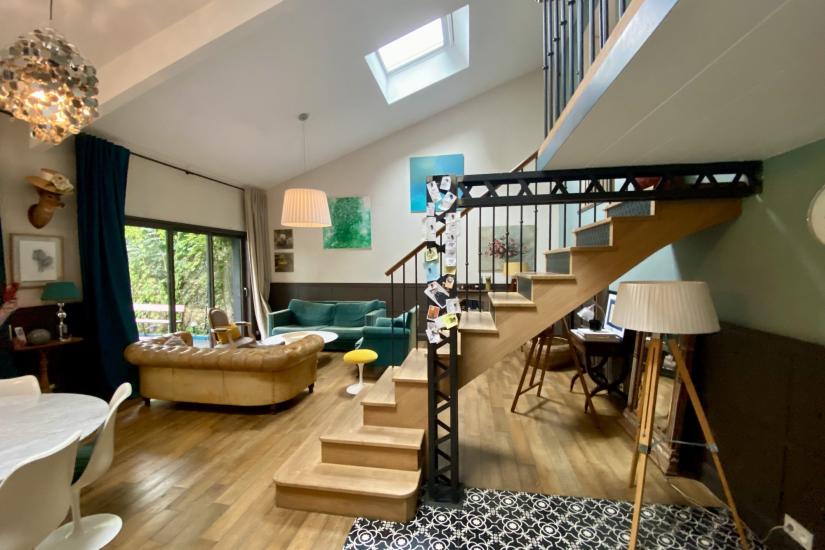 Entièrement rénovée, le séjour baigné de lumière offre une belle hauteur sous plafond et est prolongé par de larges baies vitrées ouvrant sur une terrasse intimiste exposée sud-ouest. Rare en ville, le jardin arboré de plus de 500 m² offre un véritable écrin de verdure à l'abri des regards.