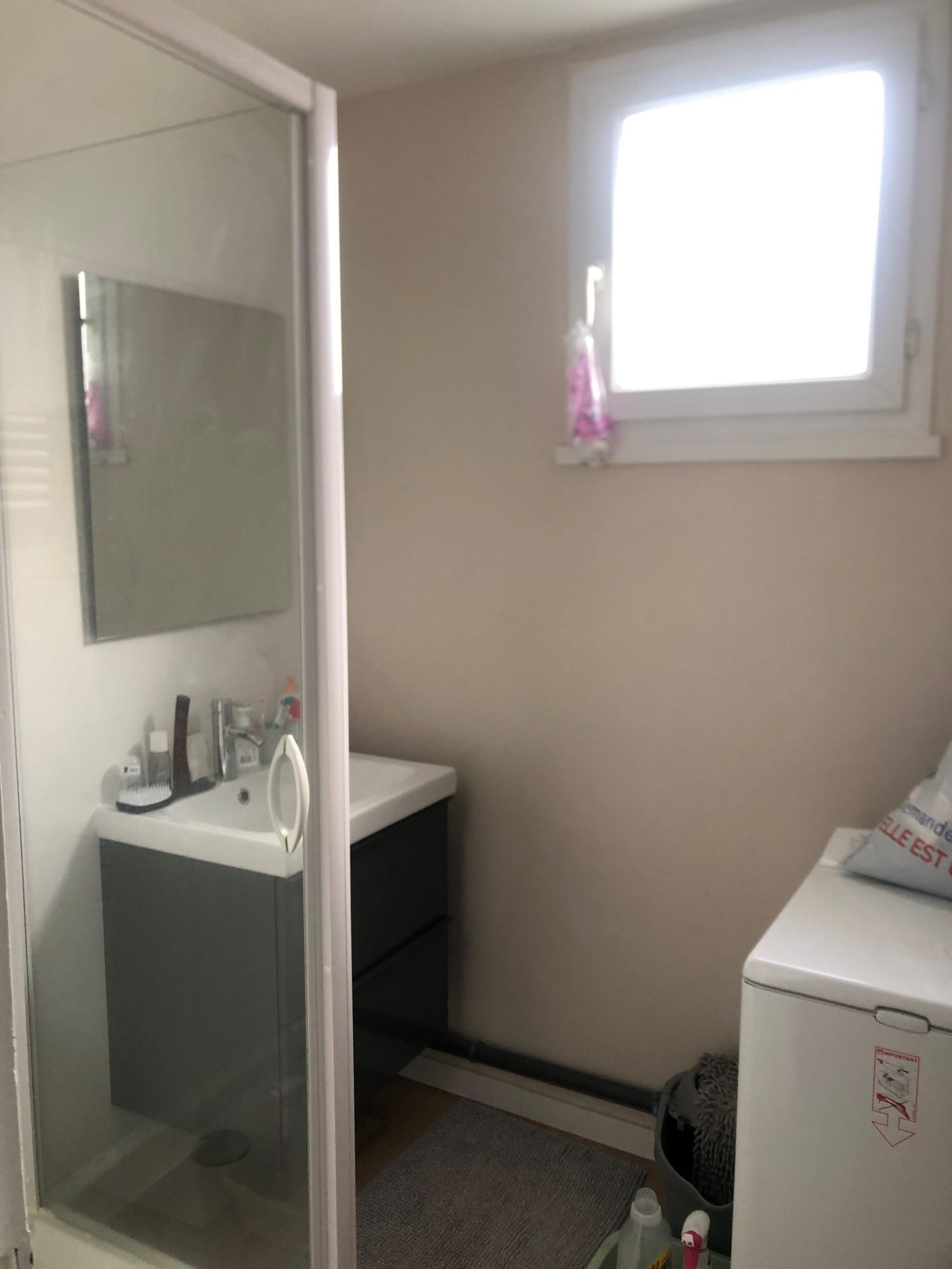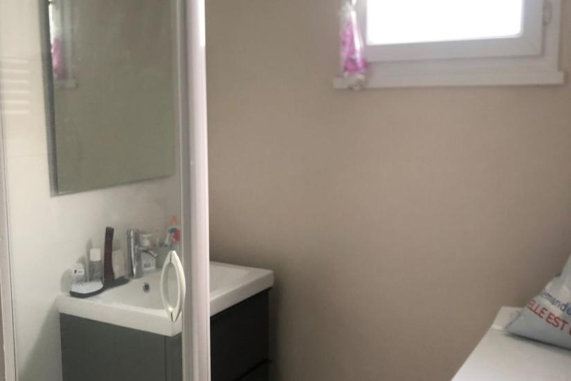 composé d'une entrée avec un grand placard, d'une cuisine ouverte aménagée et équipée ( plaque de cuisson, réfrigérateur, four micro ondes, lave linge), d'un séjour lumineux, d'une chambre, d'une salle douche, et d'un WC.