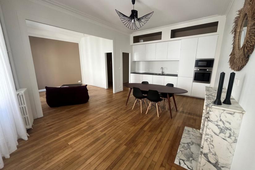 T3 Rue racine, un magnifique appartement meublé entièrement rénové. Cet appartement se compose d'une entrée desservant : un double salon séjour lumineux ouvert sur une cuisine aménagée et équipée, deux chambres et une salle de bain.