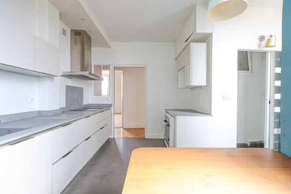 Copernic - Appartement lumineux de 117 m² comprenant de beaux volumes et une vue dégagée sur les toits de Nantes. En dernier étage avec ascenseur, il se compose d'un grand séjour sur parquet, d'une cuisine équipée avec une buanderie attenante, 3 chambres de bonne taille avec rangement. Situation recherchée en plein cœur du triangle d'or nantais, au pied des commerces et des transports. Cave et local à vélo.