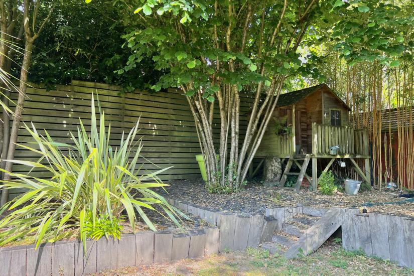 De plain-pied sur le jardin : un beau séjour avec cheminée ainsi qu'une cuisine familiale ouverte avec îlot central donnant sur une grande terrasse conviviale. Un bel espace parental avec chambre, bureau, dressing, salle d'eau et WC.